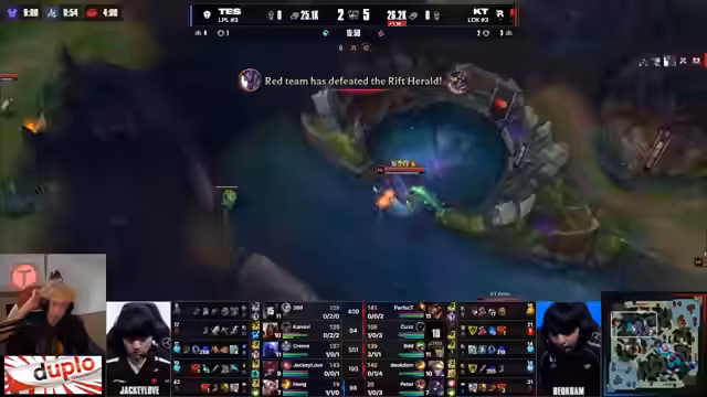 08:50:44Die optimale Nutzung von Herald wird diskutiert: Während früher Herald oft vor einem Fight für einen Turm eingesetzt wurde, wird er heutzutage manchmal für Teamfights aufgespart, um als mobile 'Sonja' zu dienen, wie T1 es oft praktiziert. Im ersten Zehn-Mann-Teamfight spawnt Kass Herald, um flashlose Ziele zu engagieren. Obwohl der Drake verloren geht, gewinnt KT den Teamfight und sichert sich wichtiges Gold. Die Bedeutung von 'Soul Point' und Corkis Item-Power-Spike wird hervorgehoben. Ein schlechter Engage von 369 auf der Toplane führt zu einem erfolgreichen Counter-Play von Rumble, der viel Schaden verursacht und den Fight maßgeblich beeinflusst. KT macht jedoch Fehler im Teamfight, was zu einem 4 gegen 3 führt. Trotzdem gewinnt KT den Fight, wobei Perfect eine herausragende Leistung als Rumble zeigt und mehrere Gegner ausspielt. Peter, der Support von KT, macht einige Fehlentscheidungen, was zu seiner Frustration führt. Top E-Sports hat bereits drei Drakes, weshalb der nächste Fight um die Soul geht. Die Chinesen versuchen, Korki ohne Flash zu bestrafen, scheitern aber und KT sichert sich den ersten Drake. Ein Fehler von Jacky Love führt dazu, dass KT einen Kill auf Kaisa erzielt, was durch die Attackern-Interaktion mit Slows ermöglicht wird. Katie gewinnt die Soul und baut einen erheblichen Goldvorteil auf, was das Spiel für sie sehr gut aussehen lässt.