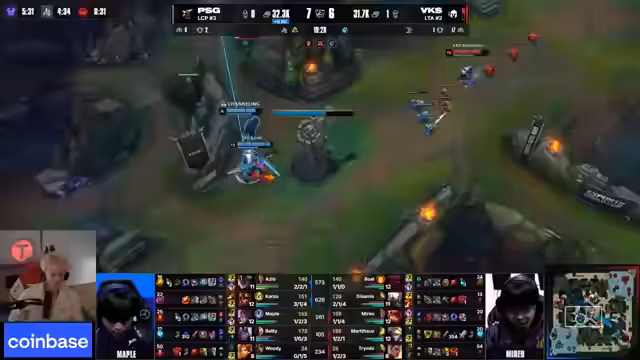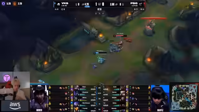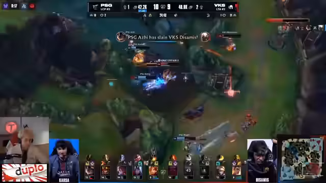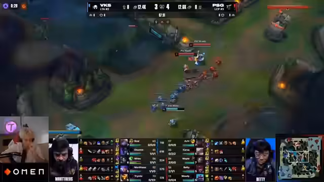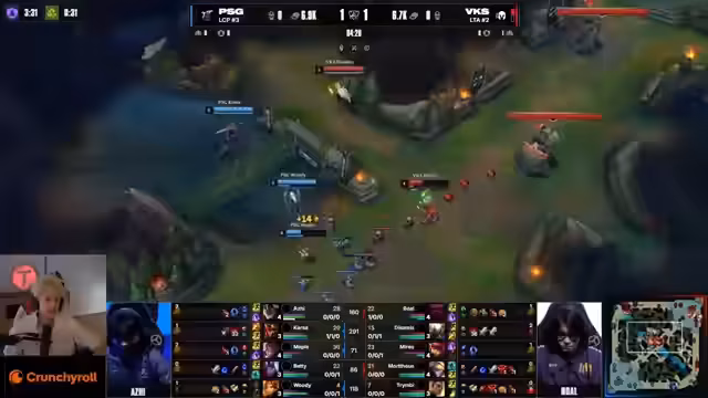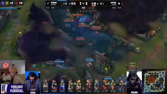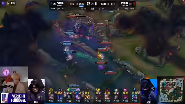 11:25:39Nach dem erfolgreichen Invade der Brasilianer kommt es zu weiteren intensiven Kämpfen. Karsa versucht sich zu rächen, aber Nocturne wird trotz Blue Buff und Wraps getötet, was zu einem Reset mit Triumph für Karsa führt. Die Bot-Lane eskaliert zu einem Double Kill für Xayah, gefolgt von einem Desaster für Brasilien, als Akali und Mortius ebenfalls sterben. Insgesamt sind acht Champions in die Kämpfe involviert, wobei beide Jungler keinen Zentimeter abtreten wollen. Diese frühen Teamfights führen zu einem deutlichen Goldvorteil für PSG, insbesondere für Orianna, die durch Kills und Assists sehr tanky wird und Katalyst fertigstellt. Maple, ein erfahrener Veteran, dominiert die Mid-Lane mit Orianna, was die Lage für Akali und Nocturne erschwert, da sie in Teamfights nicht effektiv reingehen können, ohne selbst zu sterben.