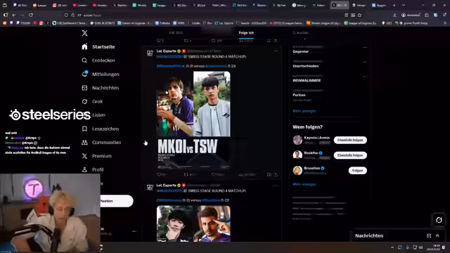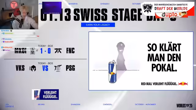 09:12:33Die Worlds Swiss Stage erreicht ihre heiße Phase, wobei Elimination-Matches anstehen, bei denen Verlierer ausscheiden. Die Auslosung für die nächsten Partien wird erst nach Abschluss des aktuellen Spieltages erfolgen, da noch ein Team aus der nächsten Begegnung fehlt. Tolkin zeigt Verständnis für die chancenlosen Niederlagen eines Teams, lobt aber einen guten Win. Das nächste Spiel beginnt in etwa 10 Minuten. Im Anschluss an diese Ankündigungen wird ein Interview mit Super geführt, in dem er seine Überzeugung zum Ausdruck bringt, dass sein Team Fnatic schlagen kann, da sie deren Spielweise kennen und in früheren Begegnungen erfolgreich waren. Die Freude über das Erreichen der nächsten Phase ist spürbar, besonders als ein Spieler einen Uzi-Skin sieht, was eine emotionale Reaktion hervorruft und die Bedeutung von Uzi in der Szene unterstreicht. Die authentischen Reaktionen der Spieler werden positiv hervorgehoben.