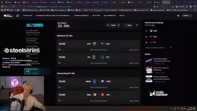 06:38:08Für die Worlds Finals in China wird es dieses Jahr leider keine europäischen Co-Streams vor Ort geben. Die Möglichkeit, nach China zu reisen, besteht für europäische Streamer nicht. Dies bedeutet, dass die Übertragung der Finals voraussichtlich von zu Hause aus stattfinden wird. Die Erfahrungen mit früheren Offen-Events aus Studios waren oft von technischen Problemen wie Audio-Issues begleitet, was die Entscheidung für eine Übertragung von zu Hause aus verstärkt. Ein Traum wäre gewesen, eine Watchparty aus der LEC Arena zu veranstalten, da dort die technische Infrastruktur bekannt und zuverlässig ist. Riot Games lehnte dies jedoch aufgrund von Umplanungen für die LEC 2026 ab. Daher wird der Fokus auf eine risikoärmere Übertragung von zu Hause liegen, um eine reibungslose Erfahrung für die Zuschauer zu gewährleisten.