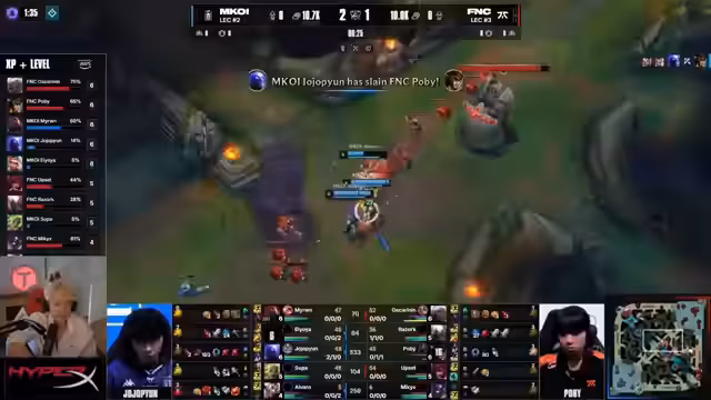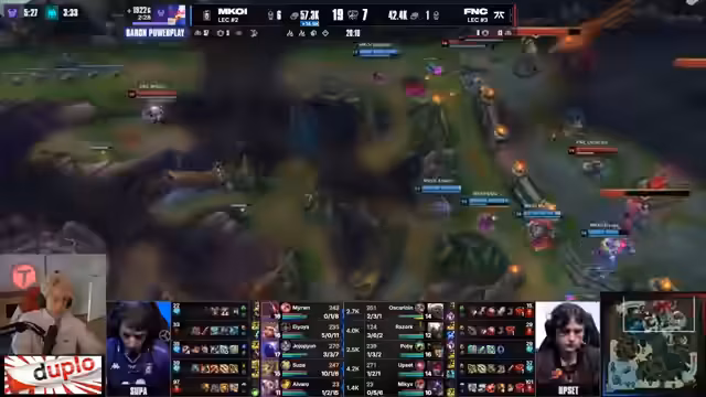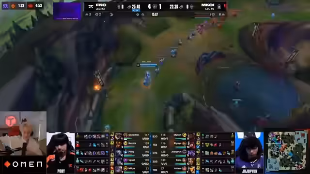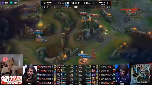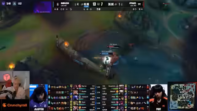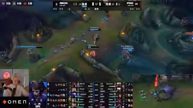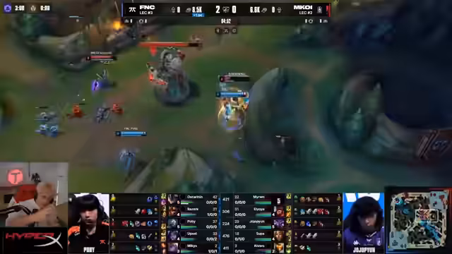 02:13:11Die blauen Spieler hatten Schwierigkeiten, Vorteile zu erzielen, während Sensaus Sunfire Cape einen deutlichen Power-Spike darstellte, den sie nutzen wollten, um die Karte zu dominieren. Trani hatte ebenfalls Triforce fertig, was jedoch teurer war als Sunfire Cape. Abset gewann im langfristigen Duell, aber ein schlechter Engage von Micky ohne Priorität führte zu einem Desaster, ähnlich einem Fehler aus Spiel 1. Alistar lief von der Midwave weg, wodurch Ezreal nicht gegen Rice gewinnen konnte. Micky ging alleine rein, und Abset konnte nicht helfen, was zu einem ungleichen 1-gegen-1-Kampf im Blue-Buff-Areal führte, den Elswee gegen Vayne unmöglich gewinnen konnte. Dieser Fehler, einfache Prioritäten zu unterschätzen, zog sich durch das Spiel. Trotzdem war das Spiel noch nicht verloren. Fnatic kämpfte gut, aber der Drache wurde zurückgesetzt, und die Spanier konnten das Smite sichern. Ein Top-Lane-Teleport von Thalia kam durch, während Oskar einen Solo-Kill verpasste, da Jojo Pran bereits Service Embrace fertig hatte. Fanatic verkackte den Drachenkampf trotz des Traum-Szenarios mit drei Triforces, wobei Super seine Unsichtbarkeit gut nutzte und Skillshots auswich. Ein Dreimann-Dive auf die Vayne scheiterte, und stattdessen wurden sie bestraft. Jojo Pran machte einen guten Top-Lane-Gang, während Jax von Sensau unter Druck gesetzt wurde.