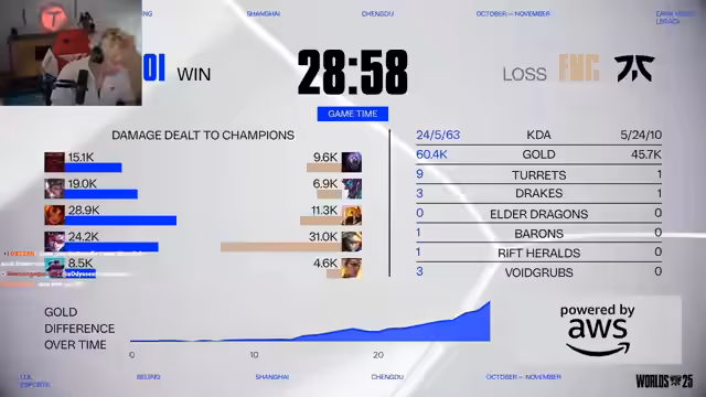 08:11:48Fnatic erzielt einen entscheidenden Sieg, indem sie den Herald sichern und den Mid-Turm erobern, was ihnen einen erheblichen Vorteil verschafft. Poby überlebt knapp einen Solo-Kill-Versuch von Kassadin, was seine Widerstandsfähigkeit unterstreicht. Der Jarvan-Win wird als erster Sieg von Fnatic bei der WM gefeiert und als Beginn eines potenziellen „Miracle Run“ verglichen mit früheren Comebacks des Teams. Der Goldvorteil von 6k und die Kontrolle über drei Drakes unterstreichen Fnatics Dominanz in diesem Spiel. Die Diskussion über die Matchups in der nächsten Runde und die Vorteile, die Fnatic durch den Sieg in Bezug auf die Draw-Dynamik hätte, wird geführt. Der Sieg wird als Beweis für Fnatics aggressive und proaktive Spielweise gewertet, die in diesem Spiel erfolgreich war und die Serie auf 1:1 ausgleicht.