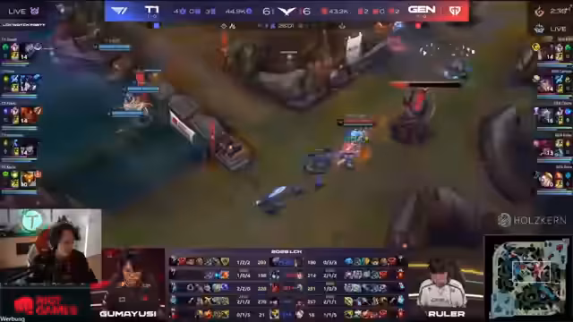 01:52:51Das Spiel eskaliert im Late Game, als beide Teams um Nashor kämpfen. Ruler auf Ezreal entscheidet sich, sein legendäres Item zu verkaufen und stattdessen Schuhe zu upgraden, was seinen Damage erheblich reduziert und seine Fähigkeit, das Spiel zu entscheiden, schwächt. Dies führt zu mehreren kritischen Fehlern von Ruler, der in zwei aufeinanderfolgenden Teamkämpfen gesteigert wird und T1 den Weg zu Nashor ebnen lässt. Dies markiert einen Wendepunkt, bei dem T1 trotz anfänglicher Probleme die Kontrolle über das Spiel übernimmt und den nexus-Turm von Gen.G. zerstört.