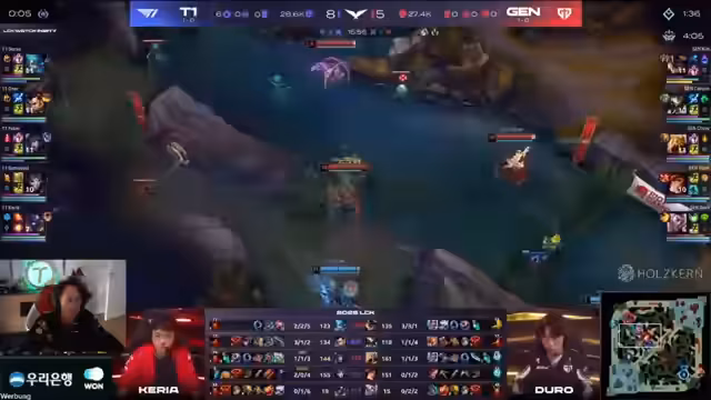 00:27:23Die Draft-Phase wird intensiv analysiert. Gen.Gs Draft mit Azir, Chou und Ahri wird als stark bewertet, während T1s Entscheidung für Gwen in der Top-Lane als riskant angesehen wird. Das Early-Game verläuft für T1 erfolgreich, da Ona einen Solo-Kill gegen Keine erzielt. Canyon und Doo von Gen.G zeigen jedoch Aggressivität und verursachen Chaos. Das erste Teamfight endet mit einem Ace für T1, das den Drachen erobern kann.