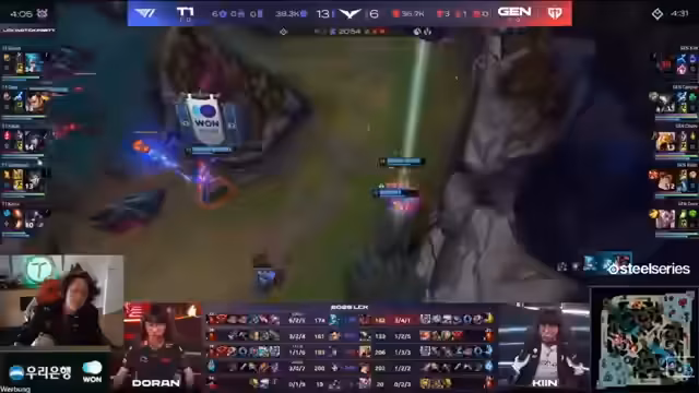 00:58:28Chovy konzentriert sich weiterhin auf das Farmen von Waves, was seinem Team ermöglicht, die Midwave zu übernehmen. Rulow wird gecatcht, was den Spielverlauf beeinflusst, da sein Schaden fehlt. T1 sichert sich unkontestiert den Drake. Chovy wird erneut gegankt und gedived, was das Gwen-Game von Doran begünstigt. Gen.G. sichert sich den Harald, wodurch T1 die Feats of Strength abgeben muss. T1 gewinnt jedoch einen Botlane-Teamfight und erhält viel Gold durch zerstörte Türme. Gen.G. verliert zwei Mid-Turrets, was ihre Kontrolle über die Karte einschränkt. Ein unerwarteter Play von T1 führt zum Tod von Kini, während Jhin mit seiner Ult Botlane diven kann. Ruler wird gefangen und getötet, was T1 einen Vorteil verschafft. Doran versucht, Momente zu kreieren, wird aber von Keria gestoppt. Faker sichert sich einen Reset-Kill und Perula erzielt einen Triple-Kill. Am Ende stehen sich die beiden Blutsverwandten, Onkel und Neffe, gegenüber. Canyons Bodyblocking ermöglicht es Ruler zu überleben, was für Gen.G. entscheidend ist. Scanners Magie und Sinsaus Fähigkeit, Gegner wegzustoßen, spielen eine wichtige Rolle in den Teamfights. Faker erzielt mit seinem Build, bestehend aus Leandris, Road of Ages und Zika's Armgat, hohen Schaden und erreicht Level 15, ein Level über Chovy.