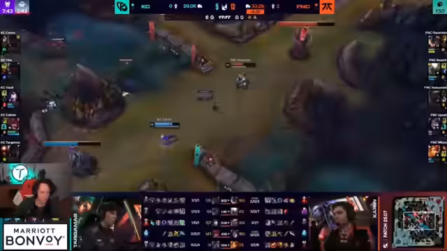 10:59:41Das Spiel beginnt mit einem kritischen Fehler von Karmine Corp in der Bot-Lane auf Level 2. Ein Missplay führt zu einem Early Kill für Fnatic und setzt einen Trend für das gesamte Game. Kommentatoren heben die schlechte 2-against-2-Lane-Performance von Karmine Corp hervor und stellen Fnatics Fähigkeit in den Fokus, frühzeitig Vorteile zu sichern und zu nutzen.