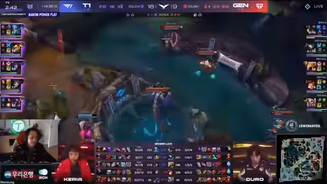 03:14:42Im Giga-Late-Game ist T1 in einer verlorenen Position. Die Nexus-Türme sind gefallen und das Team kann nur noch den Nexus verteidigen. Gen.G. kontrolliert das Spiel kontinuierlich, auch wenn T1 versuchte, durch den Bau von Schuhen die Slot-Effizenz zu verbessern. Der Analyst gibt T1 kaum noch Chancen und beschreibt die Situation als „too little too late“. Der Screenshot zeigt die verlorene Basis von T1, die von Gen.G. belagert wird. Es ist nur noch eine Frage der Zeit, bis das Spiel entschieden ist.