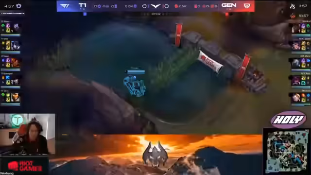 02:15:11Die Teams liefern sich intensive 1-2-1-Fights, wobei Poppy den Ezreal ultet und gegen Galio kämpft, der jedoch durch Zhonyas überlebt. Der Fokus wechselt auf Kane und Doran, während Gen.G und T1 beide nur noch einen Nexus-Turm haben. Gen.G's Nexus-Turm respawnt bereits. Ruler sichert sich respektlos einen weiteren Kill. Trotz der schwierigen Situation hält T1 den Nexus und kann wieder Sideline spielen, was die Chance auf einen Sieg eröffnet. Gen.G dominiert jedoch weiterhin durch Drake und die Kontrolle über die Seele, was durch den Spawn von Baron Nashor und Elder Drake zusätzlich verstärkt wird. Der Tod von Kiria erweist sich als besonders kostspielig für T1, da dadurch wichtige Wardsets fehlen und Gen.G den Eldar sichert. T1 ist gezwungen, einen Teamfight zu erzwingen, obwohl die Voraussetzungen dafür ungünstig sind. Nach mehreren riskanten Spielzügen von Faker und Ruler geht das Spiel in ein 1-1, wobei Gen.G eine Ruler-zentrierte Komposition spielt, die darauf abzielt, ihn zu schützen. T1 profitiert von Gen.Gs Fehlern im Early Game, während Gen.G insgesamt inaktiver wirkt als gewohnt.