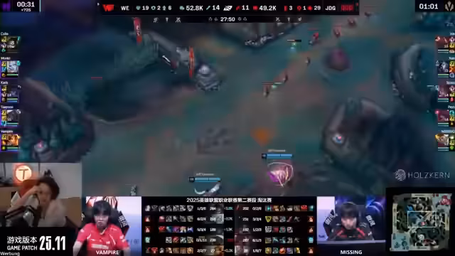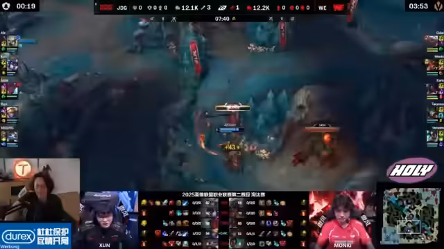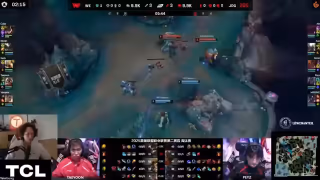 01:43:12Im early Game dominiert J.D.G. die Seitenlanes. Ihr Mid-Laner hat die Better-Bekämpfung auf der Top-Lane gegen die von WE gespielte Gwen übernommen, was WE stark unter Druck setzt. Auch im Jungle-Engagement bei dem Versuch, von J.D.G. den Baron zu stehlen, ist J.D.G. erfolgreich. Ihre AD-Carry lässt sich tauschen und sterbt, doch J.D.G. nutzt die Situation, um weiter im Jungle zu invaden und Druck auf den Top-Lane-Turm auszuüben. Der von WE gespielte Kha'Zix ist zudem in einer prekären Position ohne Manapool, was seine Handlungsfähigkeit stark einschränkt.
