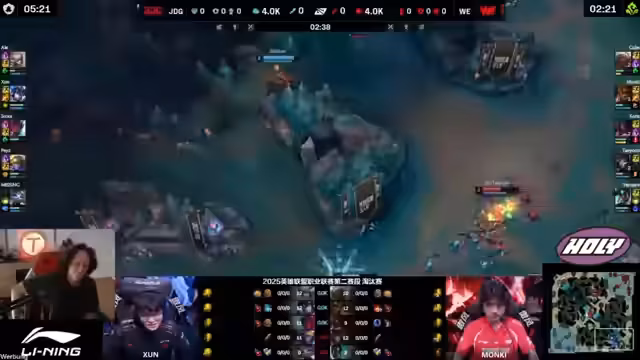 00:53:32Vor dem anstehenden Qualifying-Match für die MSI wird die Stärke der chinesischen Liga gegenüber Korea hinterfragt. JDG gilt als Favorit, ist durch das Roster-Wechsel geschwächt. Im laufenden Spiel zeigt JDG eine aggressive Bot-Lane-Strategie, welche einen unfairen Tausch erzwingt. Ein entscheidender Fehler von Monkey, einem Top-Laner von JDG, führt jedoch zu einem unnötigen Tod und einem Goldvorteil für WE. Dieser Fehlgriff wird durch einen erfolgreichen Catch von JDG im Mid-Spiel jedoch wieder neutralisiert, was dem Spiel eine wichtige Wendung gibt.