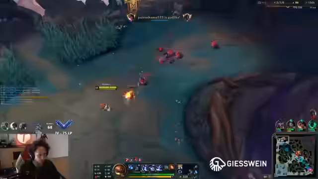 06:12:19Ein Spiel wird durch den AFK eines Mitspielers entschieden und verloren. Trotz eines klaren Vorteils und der Möglichkeit, das Spiel zu gewinnen, wird ein Vote-Forfeit abgelehnt, da der verlorene Spieler bald wieder verbunden sein könnte. Der Streamer argumentiert, dass ein Sieg möglich ist. Allerdings bricht der nachfolgende Stream komplett zusammen, als ein weiterer Mitspieler nach einem schlechten Start ebenfalls AFK geht. Die Challenge, Yasuo, wird damit der sechste Champion, der durch einen AFK verloren geht. Das Spiel wird daraufhin FF.