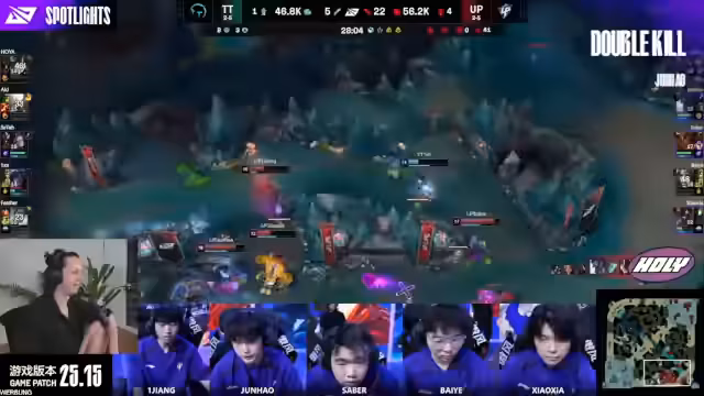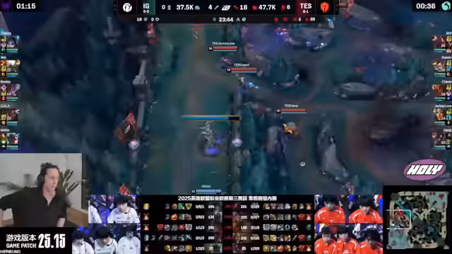 03:12:01Durch die frühen Fehler von Navi kommt Mobistar Koi aus dem Nichts und überholt Navi mit einem Goldvorsprung von 3000 Gold. Das Spiel wird dadurch extrem spannend. Trotzdem wird Navi als bessere und favorisierte Mannschaft angesehen, da ihr Draft im Late Game, insbesondere mit der Jinx, stärker erscheint. Der Kommentator kritisiert auch die Meta-Entwicklung, wie die Rückkehr von On-Hit-Kaiser durch die hohe Popularität von AP-Champions auf der Top-Lane und die Option, nun Triple-AP-Compositionen zu spielen.