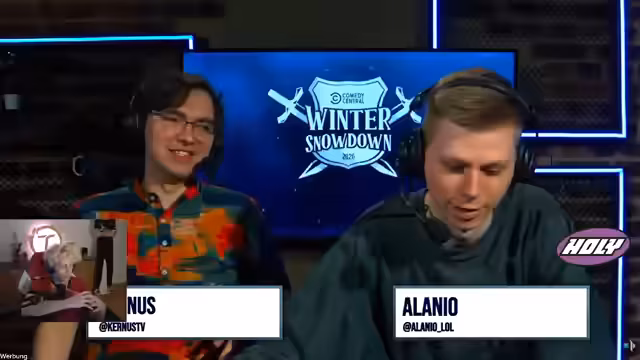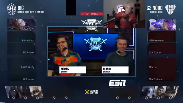 03:44:31Nach einem kurzen Moment wird das letzte Game des Abends im Snowdown Showdown von Comedy Central angekündigt. Der Sprecher erwähnt, dass sein Team bereits 1-0 in der Serie steht und ein weiterer Sieg gegen Big sehr wichtig wäre, da es sich um einen Konkurrenten in der Prime League handelt. Die Spannung steigt, während man auf den Start des nächsten Spiels wartet und im Hintergrund noch weitere Unterstützer im Voice-Chat begrüßt.