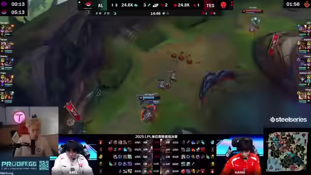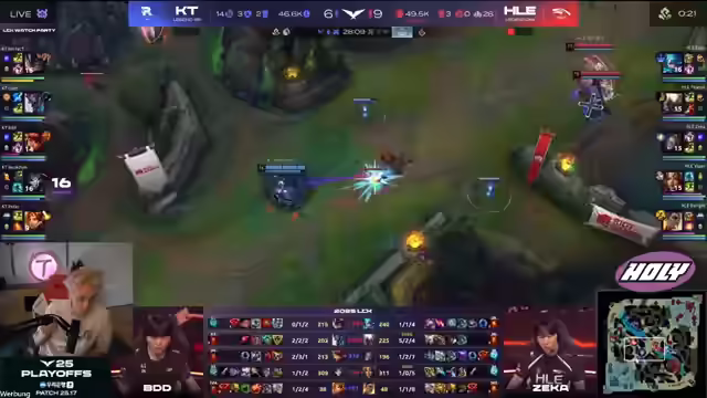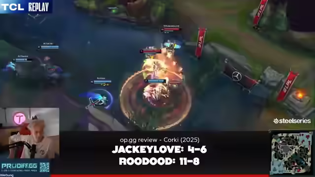00:15:29Es wird ein Level-1-Laneswap beobachtet, bei dem KT die Strategie von Hanwha gegen T1 anwendet. Der Streamer äußert seinen Unmut über die aktuelle Toplane-Meta, insbesondere über Laneswaps, die er als frustrierend empfindet. Er kritisiert die Priorisierung des AD-Carrys und äußert seinen Unmut über Riot Games für diese Meta. Trotz des anfänglichen Vorteils durch den Laneswap gelingt es KT nicht, diesen vollständig auszunutzen. Hanwha schiebt den Kanonen-Minion in Richtung Corki, um ihm Gold zu verschaffen. Der Streamer kommentiert die extreme Hingabe im Pro-Play, bei der Teams bereit sind, alles für den AD-Carry zu opfern. Er erwähnt, dass KT seit langer Zeit kein Finale mehr erreicht hat und hofft auf ihren Erfolg. Peanut erzielt einen Double Kill im Toplane, was KT einen Vorteil verschafft. Zeus' Entscheidung, keine Base zu machen, um Platten zu nehmen, wird als riskant angesehen. Der Streamer analysiert die Strategie von Hanwha, Toplane-Prio zu nutzen, um Botlane zu unterstützen. Delight carried seinen AD Carry, aber wird auch getötet.