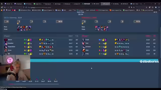 06:40:07Die Gegner könnten Nashor erzwingen, wenn die Botlane getötet wird. Die Gegner spielen Prio und erzwingen Objectives, was die Situation erschwert. Der Streamer räumt ein, dass er gegen die gegnerische Botlane machtlos ist, sobald diese einen Vorteil hat. Er überlegt, die Mitte anzugreifen, um etwas zu erreichen, da er nicht weiß, wie er sonst vorgehen soll. Der Streamer bedauert, dass ein Ult nicht eingesetzt wurde, um tief in die gegnerische Formation zu springen. Das Spiel wird als schwierig eingestuft und es wird betont, dass man sich verteidigen muss. Der Streamer gesteht ein, dass er die Botlane hätte unterstützen müssen, aber nicht wusste wie, sobald diese in Rückstand geraten war. Er bezeichnet das Spiel als schlecht und äußert seinen Unmut darüber, dass ein bestimmter Charakter gewonnen hat. Der Streamer reflektiert über seine eigenen schlechten Entscheidungen und betont die Notwendigkeit, weniger Panik-Topline-Ganks durchzuführen. Er fordert den Chat auf, seine Namen zu nennen, da er Unterstützung für eine Runde Arena benötigt. Es wird erwähnt, dass die Server nur noch bis Sonntag geöffnet sind und dass man über einen Link mitspielen kann.