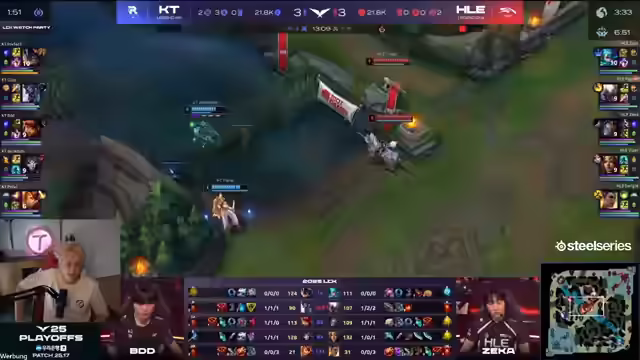 00:30:25Delight zeigt eine starke Leistung, insbesondere mit einer guten Combo von Delight und Peanut, die zu einem Double Kill führt. Der Streamer kommentiert, dass das Spiel fast vorbei aussieht und lobt Delights Spielweise. Er beschreibt eine Situation, in der Delight auf Cass Q flasht und die beiden Backliner hochwirft, was zu einem eskalierten Spiel führt. Er kritisiert Zeonius dafür, dass er nicht teleportiert. Der Streamer kommentiert, dass Lanespotting für den Topliner meistens schlecht ist, da er Gold und EXP verliert, aber es gut für das Team sein kann. Er beschreibt eine Szene, in der Rexha Harold einsetzt und Doknam flashen muss. Zeca wird getötet und KT will den Drake starten. Der Streamer lobt die Supports und beschreibt eine Szene, in der Peter einen Blutring cleart und dann den Recall abbricht. Dokdum erhält ein Bounty von 1067 Gold, was ihm einen Vorteil verschafft. Der Streamer diskutiert, ob KT das Spiel gewinnen kann, wenn sie die Seele vereiseln können. Er kritisiert AD-Carrys als verwöhnt und erwähnt einen Reddit-Thread von Ruler, in dem er sagt, dass AD-Carry nicht mehr seine echte Carry-Rolle ist. Delight findet einen geilen Blatt, aber AD-Carries hat dann auch genau keinen Flash.