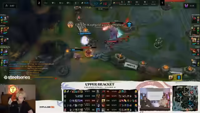 02:55:13Niki wird angewiesen, den Top-Turm zu zerstören, während die anderen Spieler sich auf die Mid-Lane und später die Bot-Lane konzentrieren. Sascha soll Vision über die Wand legen, um Nash zu schützen. Das Team plant, sich zu fünft in der Mid-Lane zu versammeln und den Drake anzugreifen, wobei die Team-Komposition aus fünf Mages und einem Jarvan für eine starke Combo genutzt werden soll. Es wird betont, dass die Ult von Tony präzise eingesetzt werden muss. Ein Versuch, durch den gegnerischen Jungle zu gehen, wird gewagt, um die Gegner zu überraschen, aber es stellt sich heraus, dass die Gegner bereits Nash angreifen. Das Team muss sich zurückziehen und die Situation neu bewerten, da der eigene Bluff aufgebraucht ist. Niki wird angewiesen, Camps zu farmen und dann zur Top-Lane zu gehen, während Sascha erneut Vision für Nash legt. Die Gegner machen Nash, aber das Team glaubt, dass sie ihn nicht flippen können und versuchen, den Drake zu sichern, um den Pyke-Spawn zu ermöglichen. Die Spieler werden angewiesen, nicht zu tief zu gehen und sich auf Kontrolle zu konzentrieren, um AoE-Ults zu treffen, falls ein Kampf entsteht. Das Spiel wird als geisteskrank und intensiv beschrieben, wobei der Zed als nerviger Gegner hervorgehoben wird.