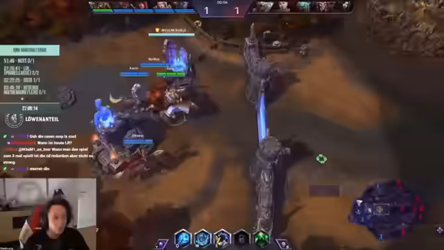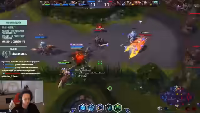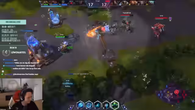02:40:09Der Stream wechselt zu Heroes of the Storm, wobei der Streamer nach einem Ban fragt und Unterstützung als Champion benötigt. Das Team startet ein Spiel, wobei es anfangs Schwierigkeiten hat, die Gegner zu kontrollieren und wichtige Ressourcen zu sichern. Es werden Taktiken wie das Halten von Schreinen und das Erstellen von Dragon Knight diskutiert. Das Team kämpft gegen ein starkes Gegnerteam, das gut im Midgame agiert, und leidet unter den eigenen hohen Verlusten.