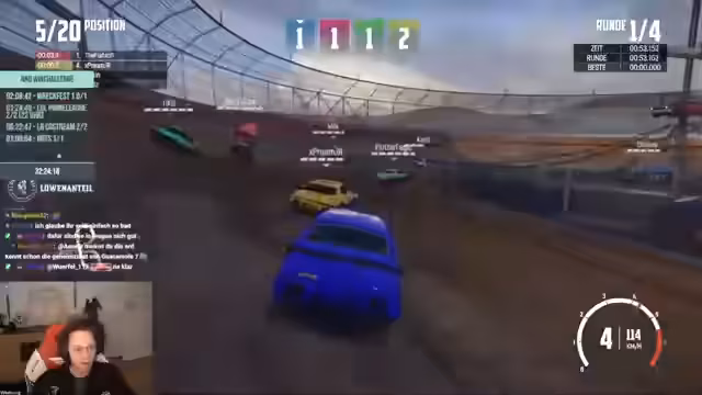 07:12:40Das Racefest beginnt und der Streamer ist zunächst Erster, wird aber schnell von anderen Teilnehmern gerammt und verliert viel HP. Die Kommunikation im Team ist nicht ideal und die Strategie, hinten zu bleiben und am Ende zu gewinnen, schlägt fehl. Der Streamer und sein Team bekommen kaum Punkte und landen auf den hinteren Plätzen. Er ist frustriert und schimpft auf das Spiel, während die anderen Teams offensichtlich besser fahren.