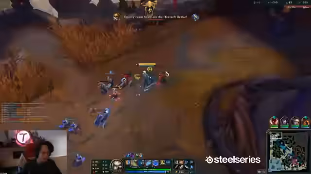 05:40:51Das Gameplay konzentriert sich auf die Kommunikation und Fehler im Team. Der Streamer analysiert eine verlorene Drache-Engagement-Phase, bei der sein Team sich schlecht positioniert hat. Er äußert Frustration über seine eigene Schwäche und die Unfähigkeit, effektiv zu teamfighten, da sein Gegner in Top Lane sehr stark ist und 'nichts tun muss' um zu gewinnen. Eine weitere Analyse betrifft die Bounty-System, das ihm seltsam vorkam, da ein hochgelevelter Gegner nur wenig Gold wert war.