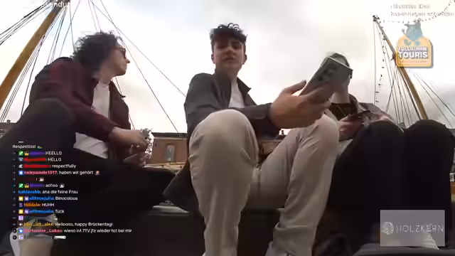 04:22:09Bevor die Tour mit dem Schiff startet, erkunden die Streamer den Hafen noch einmal. Sie filmen die Boote, die im Wasser liegen, und interagieren mit dem Chat. Sie beobachten die Menschen in der Stadt und entschließen sich, für eine Kanal-Tour zu zahlen, um eine gute Aussicht zu erhalten und den Chat mitzunehmen. Die Stimmung ist gelassen und auf die bevorstehende Tour fokussiert.