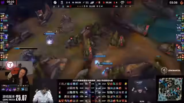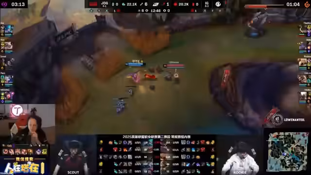 04:42:17Es wird über das Spiel ehemaliger Weltmeister und amtierender MSI Champions gesprochen. Rookie und TheShy spielen gegen Scout. Pace könnte sich zum besten LPL-Team entwickeln. Lillia wird gemocht, MF gehasst. Immer mehr Teams kehren zur Lillia-Miss Fortune-Combo zurück. Gestern wurde in Korea die Miss Fortune in der Lehrkombo gefällt. Es wird spekuliert, wer das Spiel gewinnen wird: IG oder JDG. IG ist absoluter Fan-Favorit, Scout und Pace sind weniger beliebt. Scout hat trotz der IG-Skandale viele Unterstützer. Es wird darüber diskutiert, warum nicht mehr Level 1 Terror gemacht wird, seit Laneshops entfernt wurden. IG invadet Level 1 und erzwingt einen Flash.