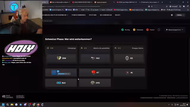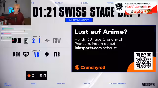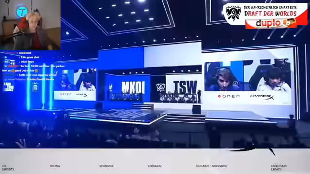 11:10:55Nach der Niederlage von Top Esports wird das Ergebnis analysiert. Der Streamer betont die beeindruckende Leistung von Gen.G, insbesondere von Chovy als Speerspitze. Es wird auch über die verbleibenden Teams bei Worlds gesprochen und wer am stärksten erscheint. Der Ausblick auf die nächsten Spiele, besonders das T1 gegen 100 Thieves, wird gegeben und wie dringlich die Situation für einige Teams ist.
