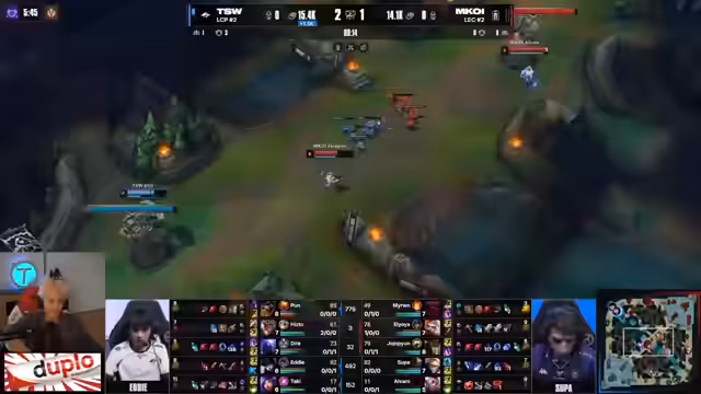 08:41:04Das Team hat sich einen erheblichen Goldvorteil erspielt und ist erstmals in Gold vorne. Mit Order-Items und Drachen führt man mittlerweile mit 3000 Gold. Die Mid-Lane arbeitet effizient, während die Bot-Lane Probleme hatte. Ein wichtiger Kill in Mid gegen Eddy ohne Flash verschafft dem Team eine gute Position. Das Team nutzt seinen Goldvorteil klug aus, um die Spielweise zu kontrollieren und Hoffnung für das dritte Spiel zu geben.