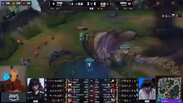 10:56:00Das Spiel startet und es wird analysiert, wie sich die Lanes entwickeln. Chovy mit seiner Ionia dominiert die Mid-Lane während Gen.G versucht, Druck auf Top auszuüben. Der Streamer bespricht die Item-Builds und wie diese die Spielweise beeinflussen. Es werden auch potenzielle Gank-Möglichkeiten erörtert und wie Pantheon-Jarvan-Kombinationen für gefährliche Engages sorgen können.