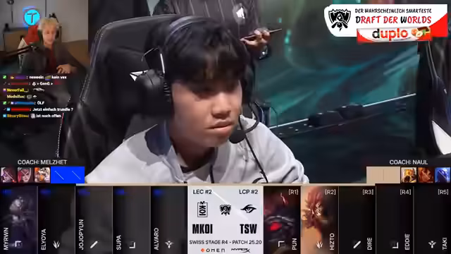 07:18:53Der Stream beginnt mit einer Diskussion über die Champion-Auswahl beider Teams. Movistar KOI wählt Trundle, der als starker Counter gegen viele Melee-Champions gilt. Team Secret Whales (TSW) reagiert mit Braum und Oriana, was als gute Antwort auf Trundle angesehen wird. Die Draft-Phase zeigt interessante Picks wie Ezreal und Corki für die Bot-Lane, die als Triforce-Champions gelten. Der Kommentator hebt die hohen Winraten von Corkli im Turnier hervor und bewertet die Draft von beiden Teams als sinnvoll und strategisch durchdacht.