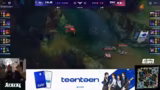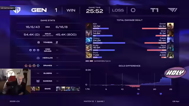 03:50:21Ein sehr kurzes und einseitiges Game gegen den amtierenden Weltmeister T1 endet für Gen.G mit einem klaren Sieg. Ein koordinierter Engage von Keen und Canyon zerstört die Backline von T1, wodurch Keen direkt mehrere Eliminierungen fährt. Mit einem Goldunterschied von 12.000 und der Zerstörung des Nexus ist der Game Over for T1. Dura wird von Chat und Streamer als MVP des Spiels vorgeschlagen, vor allem für seine entscheidende Ult beim dritten Drake.