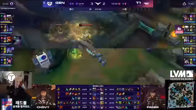 02:54:37Nach der verlorenen Drakeschlacht und einem tödlichen Fehler von Doran, der im 1-2-1 Trade stirbt, ist das Momentum bei Gen.G. T1 kann dem Druck nicht standhalten und verliert das entscheidende Teamfight am Infernal Drake. Gen.G zeigt mit einem koordinierten 'Wall-Pit' eine gute Positionierung und gewinnt den Fight, der als 'huge' und 'inoffizieller Ace' beschrieben wird. Mit dem Sieg verteidigt Gen.G seine ungeschlagene Serie in der LCK.