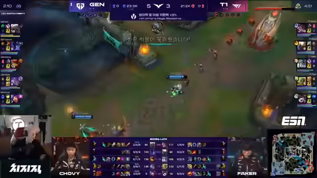 02:58:47Nach der verlorenen Drachenphase konzentriert sich T1 auf die Jagd nach Baron Nashor. Es wird eine riskierte Play initiiert, bei dem Doran stirbt, um die Chance auf den Nashor zu wahren. Der spielerische Höhepunkt ist der erfolgreiche Barondurchzug, bei dem Chovy mit seinem Sion einen wunderschönen Stun setzt, um Dorans Recall vorherzusagen und zu töten, was den Teamfight für Gen.G einleitet und den Baron sichert.