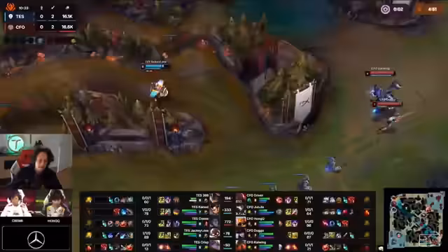 01:32:09Der Spielstand beträgt 1-0 für CFO, was im Overlay kaum erkennbar ist. Es wird ein Zuschauer erwähnt, der nach einer Weisheitszahn-OP Schmerzen hat und durch den Stream Trost findet. Jackie hat keine Flasher und wird getötet. Driver überlebt dank seines Soul Furnace. Der Stachel holt sich den ersten Kill für CFO. Es wird die wundervolle Land Assignment von CFO gelobt, die es geschafft hat, dass Rumble nicht gegen Sound gespielt hat. Am Ende catcht er den Corki, der wieder weak side war, alleine unterm Turm. Jackie wird erneut gecatcht, alleine, ohne Flash. Er war einfach zu aggressiv in diesen Games und hat ein schlechtes Turnier gespielt. Driver lebt dank Cookie plus Soul Furnace. Zion hat seine Swifties und Magic Resistance gekauft, was ihn sehr stark gegen Rumble macht. KaiWing reengaged und cancelt Cream und disengaged Canavi. CFO macht das Beste, was im Westen passieren kann: Sie könnten NA rausboxen und Europa weiterboxen. Die entscheidenden Aktionen und die strategische Spielweise von CFO tragen dazu bei, dass sie das Spiel kontrollieren und dem Sieg näherkommen.