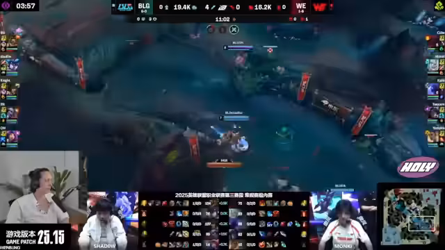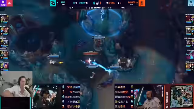 03:32:23Der Verlauf des Spiels wird durch einen frühen Teamfight an der Bot-Lane geprägt. Nach einem geglückten Invasivzug und cleverer Vision-Control gerät ein Gegner in tödliche Gefahr. Obwohl dieser knapp überlebt, wird der Fight als wichtiger Sieg für KC angesehen. Die Vision und das map-wide Bewegen des Junglers als entscheidend für den Erfolg des Engagements hervorgehoben.