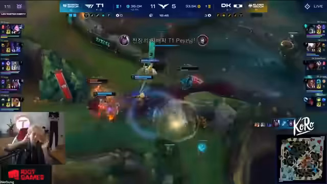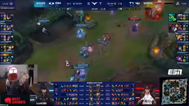 00:02:17Game 1 beginnt, und die Picks zeigen eine interessante Draft-Strategie beider Teams. Auf Seiten von DK wird das Draft um Orianna und Azir aufgebaut, während T1 auf einen starken Jungle-Engage mit einem AD-Carry wie Ezreal oder Aphelios setzt. Die Lane-Phase entwickelt sich dramatisch, insbesondere in der Botlane. Keria von T1 startet ohne Tränke, was gegen die aggressive Sw Karma-Lane von DK extrem riskant ist. Trotz dieses Starts und ständigen Poke-Drucks von DKs Botlane gelingt es T1, die Lane zu überstehen und sogar Vorteile zu erarbeiten. Oben auf der Top-Lane dominiert Doran von T1 mit aggressivem Play und setzt seinem Gegner stark zu.