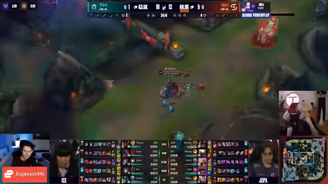 08:27:00Obwohl SK Gaming die Goldüberlegenheit hat und den Sieg eigentlich kontrollieren könnte, entscheidet sich das Team für einen riskanten Nashor-Baron-Rush. Dies geschieht, obwohl der gegnerische Flash der Zaya noch nicht verfügbar ist. Die Situation eskaliert zu einem chaotischen Teamfight, in dem SK Gaming zwei wichtige Spieler verliert und der Nashor unter sehr schlechten Bedingungen fällt. Der Goldvorteil schmilzt dadurch stark zusammen.