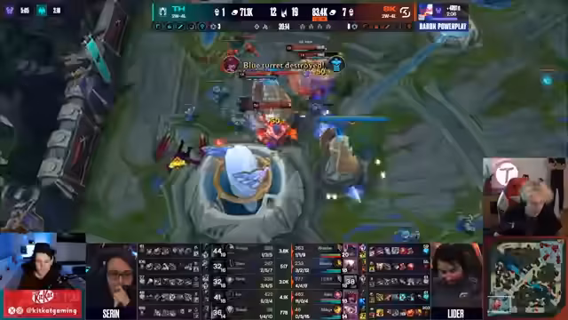 12:58:28Im späteren Spielverlauf tritt der Fokus auf das Scaling der Champions zutage, insbesondere der AD-Carry. Kommentatoren heben hervor, dass Movistar Legacy starkes Scaling hat, während T1 auf Drakes und Map-Control setzt. Ein großer Teamfight um den Baron Nashor entscheidet das Spiel. Hier glänzt Baus mit einem extrem klaren Play, indem er den Baron mit einem perfecten Steal sichert und anschließend seine Teamkameraden zu einem Four-Kill führt. Damit sichert sich Loser Tones eine solide Goldbasis und setzt den Grundstein für den Sieg.