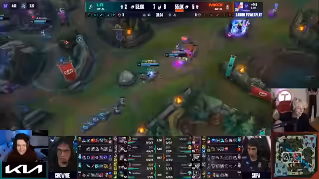 11:16:04Aus der Perspektive von KCB wird die desperate Lage analysiert. Ein Front-to-Back-Teamfight scheint aussichtslos, da G2 zu stark ist. Der Streamer schlägt daher eine riskante Strategie vor: ein 'Side-Lane Overload'. Dies bedeutet, dass KCB mehr Spieler auf einer Side-Lane als G2 stationieren muss, um dort einen Kill zu erzwingen und eine Überzahl zu generieren, die sie anschließend am Baron oder Drake nutzen könnte. Diese Strategie ist jedoch extrem schwierig und hängt von einem entscheidenden Fehler von Hans oder einem der Spieler von G2 ab, sowie von dem Nutzen globaler Ultimates wie von Talia. Ansonsten bleibt der Ausblick für KCB sehr düster.