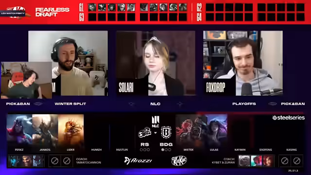00:19:47Im Verlauf von Spiel 1 kommentiert der Streamer den Kampf zwischen den Lanes. Dabei wird ein Lane-Swap von HLE beobachtet, um den Farm ihrer Kai'Sa zu optimieren und DK unter Druck zu setzen. Dies führt zu weniger Aktion im Early Game. Der Fokus verschiebt sich später auf Teamkämpfe, in denen HLE durch gezielte Engagements und gute Positionierung, insbesondere mit der Zyra-Support, Vorteile erringt. DKs Draft, trotz seiner starken Picks, wird als schwer ausführlich kritisiert, da die fehlenden Damage-Anteile es unmöglich machen, wirkungsvoll gegen HLEs Frontline zu agieren.