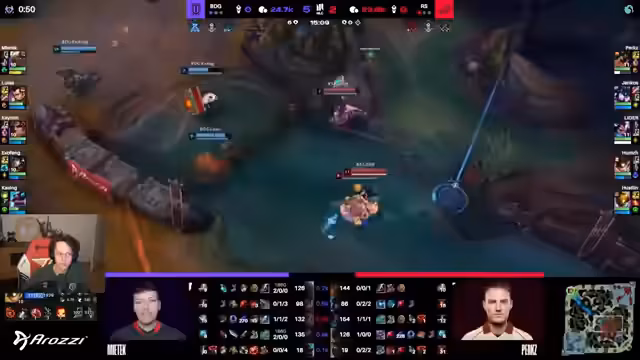 09:32:28Während des Spiels kommentiert der Streamer die laufende Action. Er beobachtet einen Gank von Jankos im Mid-Lane, der jedoch schlecht ausgeführt wird und in einem Flash-Quad des gegnerischen Ahri endet. Er analysiert die Rolle der Irelia, die in diesem Spiel nutzlos erscheint und kein Tempo erzeugen kann. Das gegnerische Team arbeitet gut zusammen, während das eigene Team Schwächen in der Koordination zeigt.