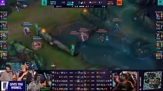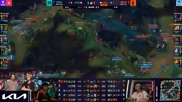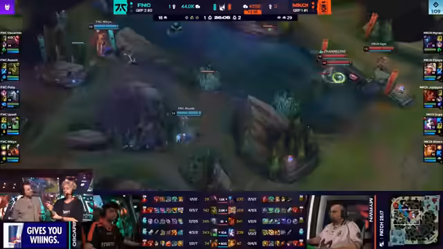 01:15:09M-Coyle hat die Kontrolle über den Dragon. Fnatic versucht, woanders zu blazen. Oskar verursacht hohen Schaden und Mervyn hat seinen Teleport noch nicht bereit. Zaya one-shotted den Dragon, Fnatic spielt riskant. Mervyn wird gezoned und geflasht. Fnatic bekommt nichts für die Seele. Fnatic verliert Drakes, den Mid-Turm und den Top-Turm. Der Baron wird nicht effektiv genutzt. Fnatic verliert Gold. Miki's Zoning ist gut, aber es reicht nicht. Fnatic hat mehr Flashes investiert als Movistar. Galio spielt mit Slow. Oriana geht null Anti-Tank. Fnatic setzt einen Death-Push auf. Aurora bekommt keinen guten Flag mehr hin. Fnatic hat viel Space. Wukong bereitet den Uraner-Shock vor. Aurora wird komplett gewoneshottet. M-Coyle ist nicht da. Fnatic bekommt die Seele und einen Double-Kill. Oskar macht ein wundervolles Spiel. Fnatic gewinnt das Spiel, trotz eines dicken Fehlers im Early-Game. Civi und Arova waren crazy im Game.