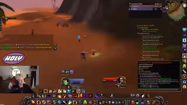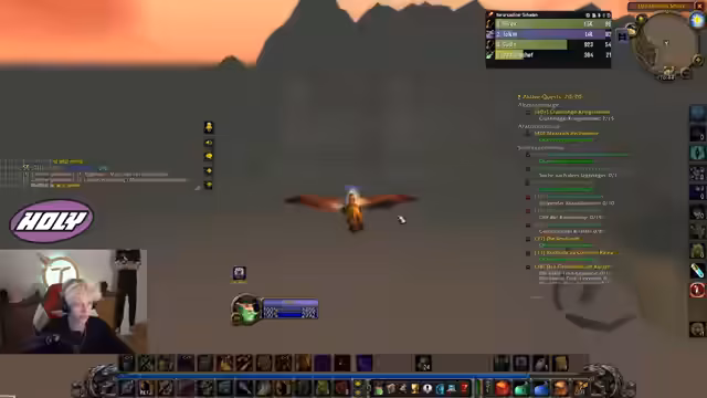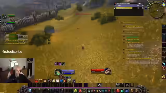 04:54:33Die Gruppe beginnt nun mit dem Questen im Ödland. Dabei kommt es zu Herausforderungen im Agro-Management. Der Tank hat Schwierigkeiten, die Aggro der Monster zu halten, da durch World Buffs zu viel Schaden verursacht wird und die Pets der Gruppe zu viel Schaden anrichten. Es werden grundlegende Taktiken wie das Sammeln der Mobs (Pullen) und das Fokussieren auf ein Ziel besprochen, um den Schlachtzug koordiniert zu halten und unnötiges Sterben zu vermeiden. Das Ziel ist es, die Quests effizient abzuschließen.