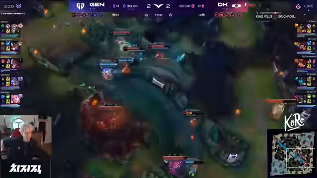 00:30:07Nongshim Red Force hat den ersten Draken erfolgreich verteidigt und dabei wichtige Kills erzielt. Der Streamer analysiert die Teamkämpfe und hebt hervor, dass die Positionierung von KDRX's Jungler 'SpongeBung' nicht optimal war. KDRX's Top-Laner 'Kingen' auf Jace hat ein schwieriges Spiel mit einer schlechten K/D-Rate, während Nongshims Yorick stark im Spiel wirkt. Der Goldvorteil von Nongshim wächst stetig an.