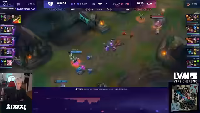06:19:26Während der Stream-Pause berichtet der Streamer vom historischen Sieg von Damwon Gaming gegen Gen.G. Es war der erste Sieg für Damwon seit fünf Jahren. Besonders bemerkenswert ist die Tatsache, dass Damwon trotz einer schwachen Draft in Game 2 durch starkes Early Game gewinnen konnte und den langjährigen Bumerang gegen Gen.G durchbrochen hat, was als sehr große Überraschung gilt.