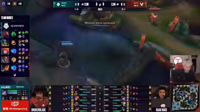 07:25:29Das Spiel beginnt und sofort kommt es zum ersten Fight in der Bot-Lane. Ashe wird ohne Vision angegriffen und erleidet First Blood. Dies führt zu einem disadvantage für die Bot-Lane von G2. Gleichzeitig kämpfen die Top-Laner um die Lane-Dominanz, wobei Nasus mit seinem Tank-Items sehr robust wirkt. Das frühe Game verläuft bereits sehr volatile und entscheidend.