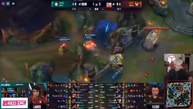 08:28:58Das Spiel eskaliert in Teamfights, bei denen die Items eine entscheidende Rolle spielen. Olaf erhält Strikebreaker, was ihn zu einer Bedrohung macht, während Mundo Protoplasm Harness kauft, um tankiger zu werden. Analysten diskutieren, ob dies eine gute Wahl ist oder ob er Heartsteal hätte bauen sollen, da dies seine späße Spielstärke beeinträchtigt. Vitality führt nach einem sehr gut koordinierten Teamfight, bei dem Namys mit seinen Orbs großen Schaden verursacht und anschließend den Drake kauft, was zu einem signifikanten Goldvorsprung führt.