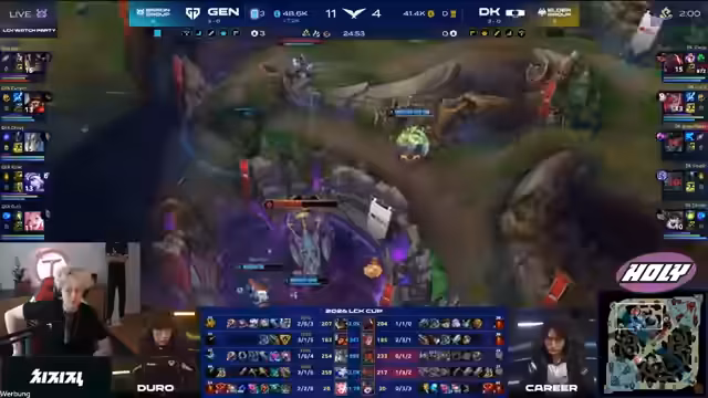 02:45:50D.K. macht mehrere unkoordinierte Moves, wodurch Gen.G. seine Dominanz weiter ausbauen kann. Ein fehlgeschlagener Engage-Versuch führt zu einem kostenlosen Spider-Drachen für Gen.G. Chovy's Champion greift den gestressten Jungle von D.K. an, während dieser den Herald nicht einsammeln kann. Gen.G. nutzt den Goldvorteil von über 4.000 Gold, um einen Teamfight zu beginnen und durch gewinnbringende Smite-Dice-Entscheidungen einen Lead zu sichern, der das Spiel zugunsten von Gen.G. kippt.