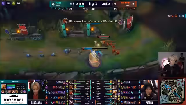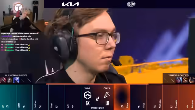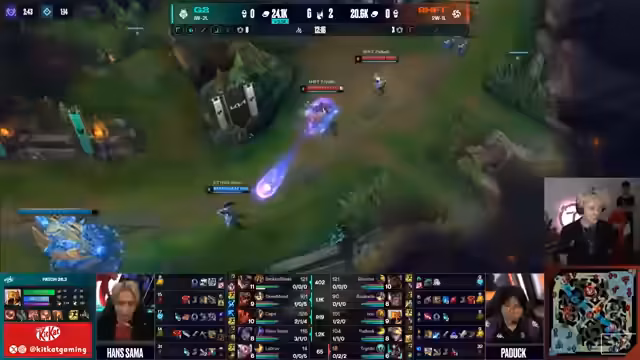 08:40:46Das beginnt mit einer ruhigen Lane-Phase, in der Hans Sama auf seinem Kai'Sa Druck aufbaut und ein angenehmes Match-up gegen Rakan darstellt. Broken Blade mit seinem Rumble erhält viel Prio und beginnt die Lane zu dominieren. Das erste größere Teamfight beginnt, als Shifters mit mehr Druck auf die Bot-Lane einsteigt. Caps verpasst einen Kill, was G2 in Schwierigkeiten bringt, während Shifters den Vorteil nutzen, um in die Dräken zu gehen und den ersten Draken für sich zu entscheiden.