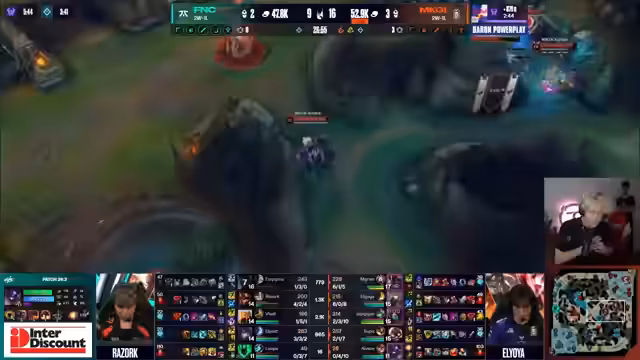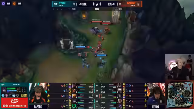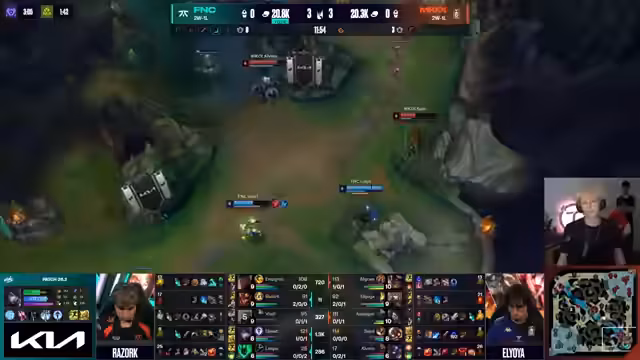 10:49:15Nach einem gescheiterten Nashor-Versuch von Movistar stabilisiert sich das Spiel. Upset erreicht sein 3-Item-Spike und outskaliert den Corki. Fnatic agiert chaotisch, aber effektiv, und gewinnt das Teamfight. Akali und Pantheon spielen eine entscheidende Rolle, während Movistar die richtige Chance zum Gegenangriff verpasst und das Spiel letztendlich verliert.